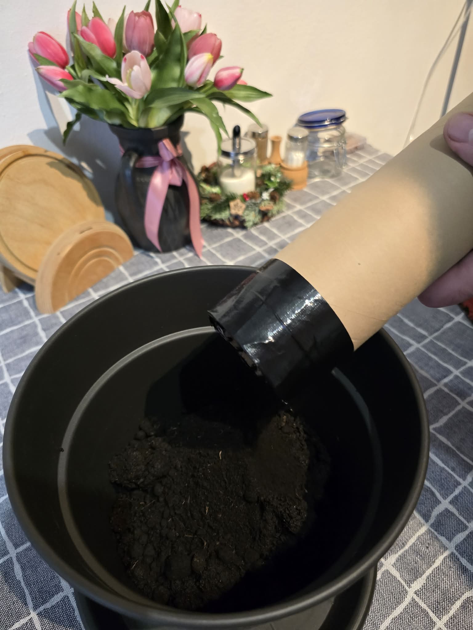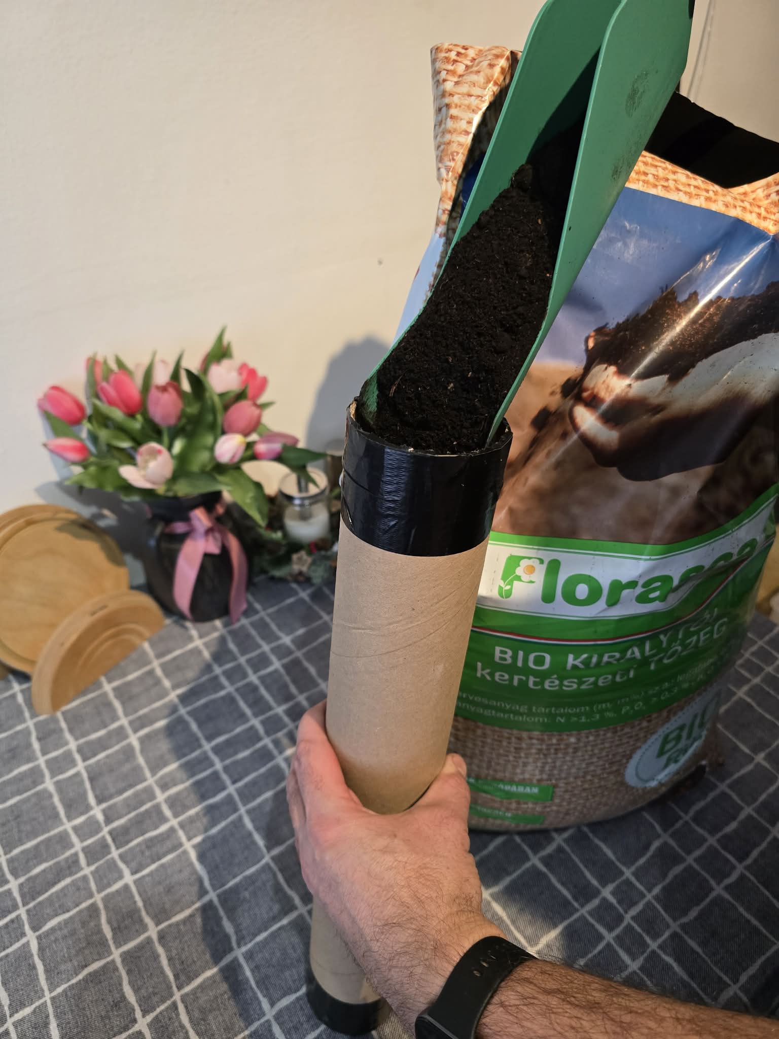 A papír hengerben lévő tőzeget öntsük a virágcserépbe.