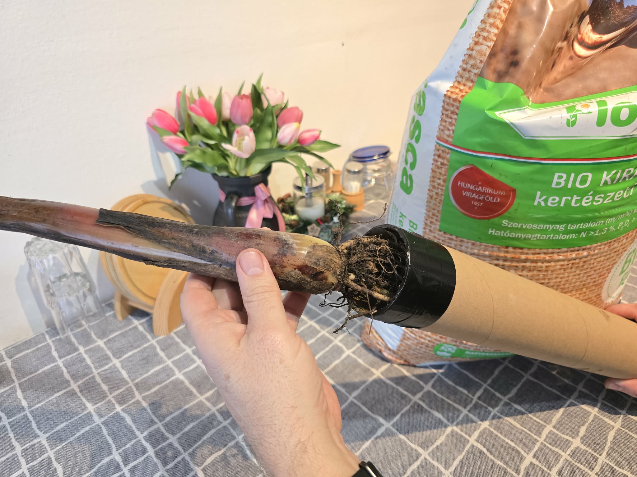 A növényt vegyük ki a papírhengerből.