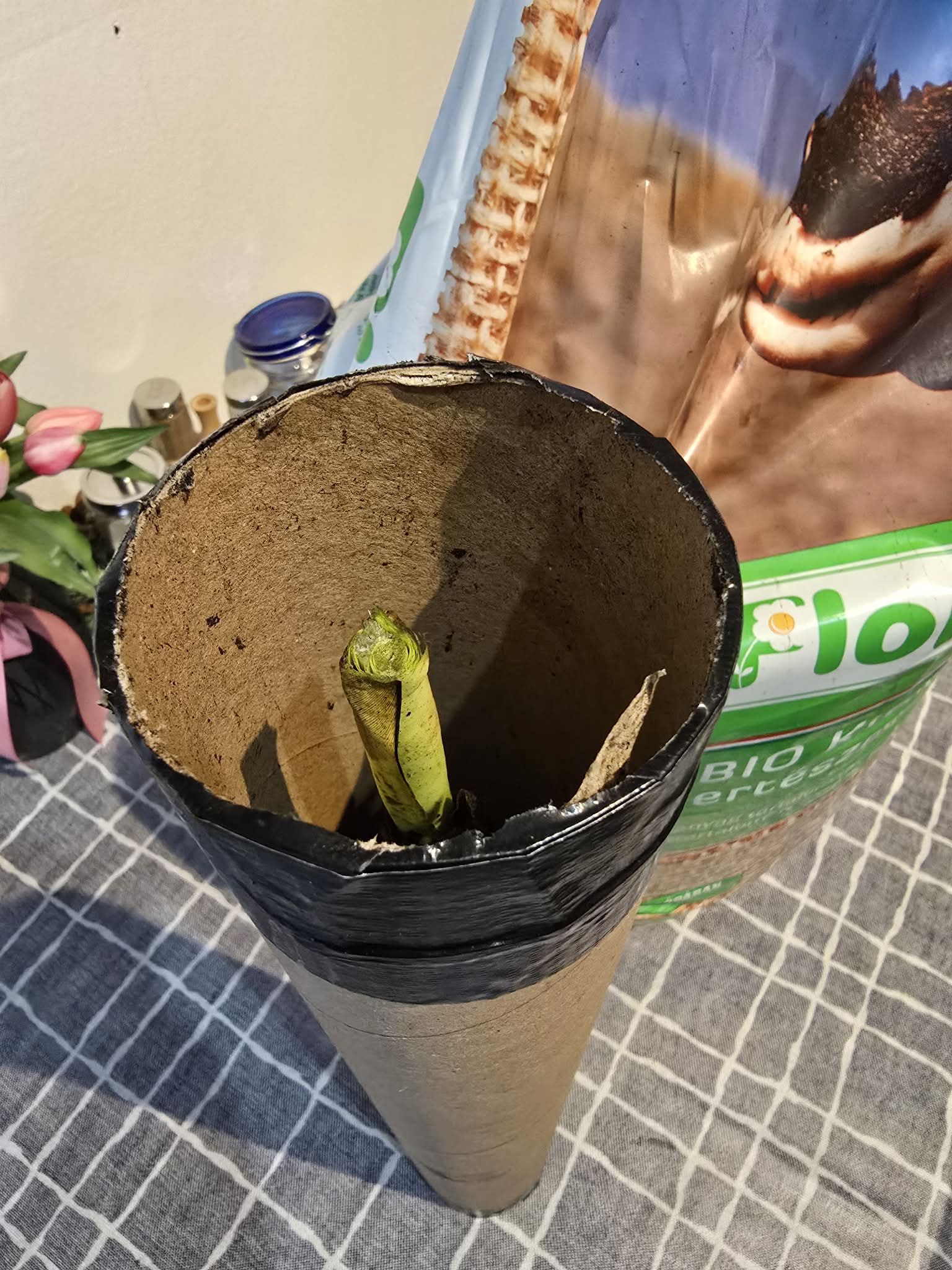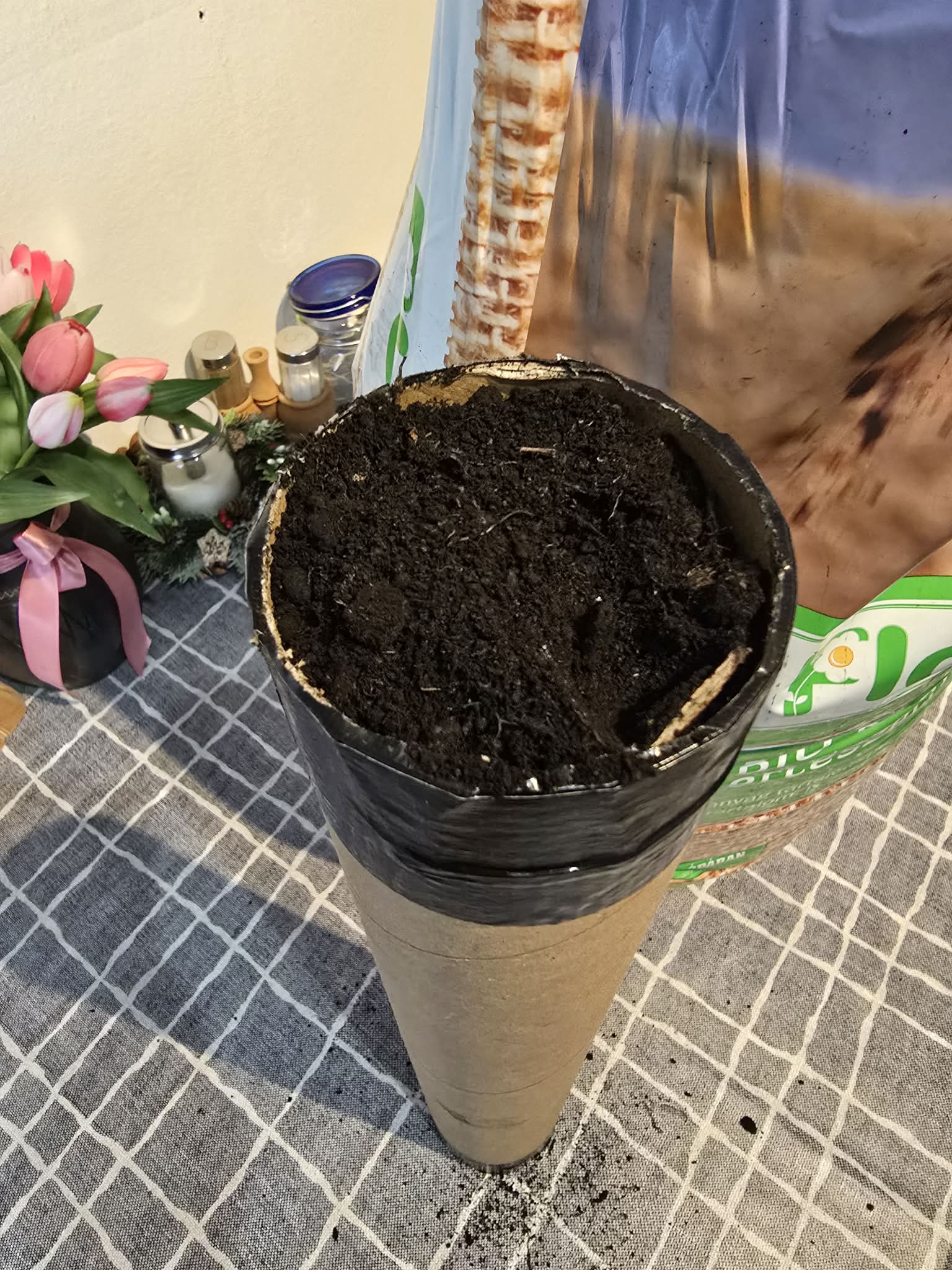 A papír hengerben a növény melletti és feletti rést tőzeggel feltöltjük.