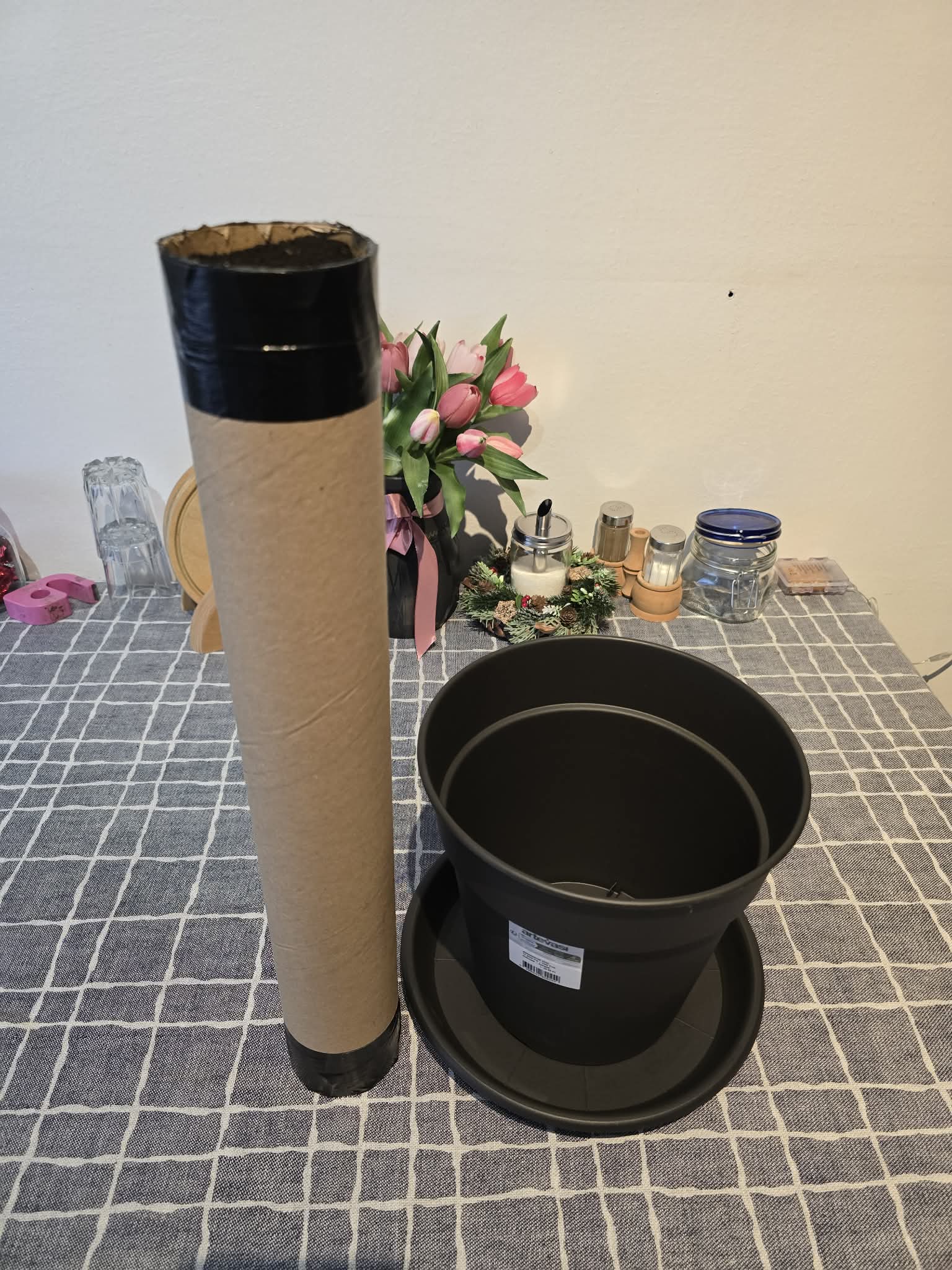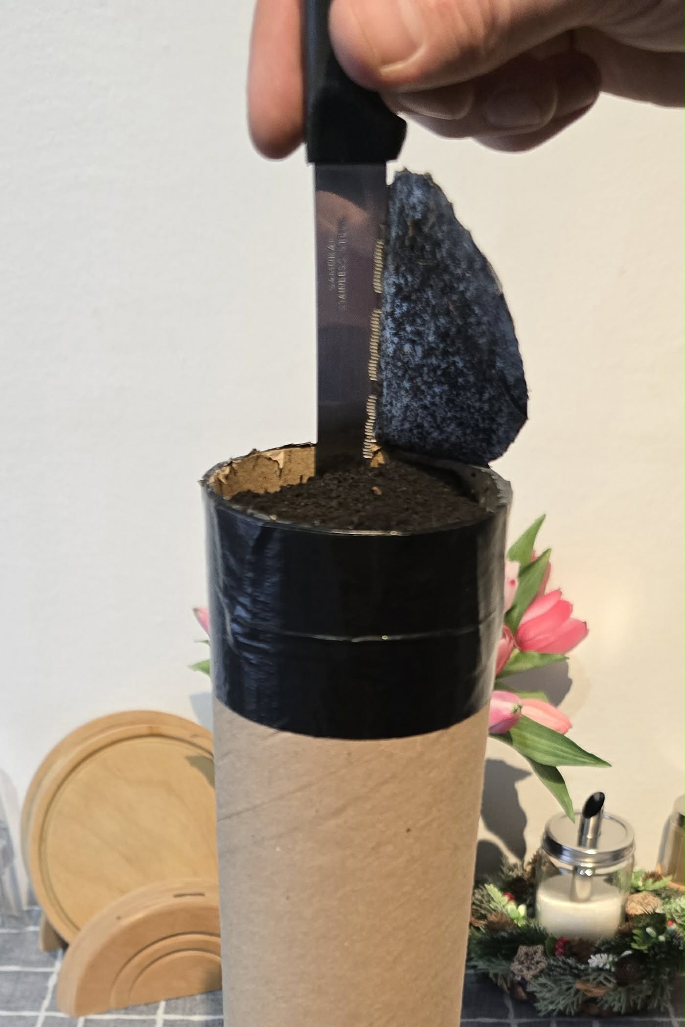A papír henger aljába pár centiméter vastagon tőzeg kerül.