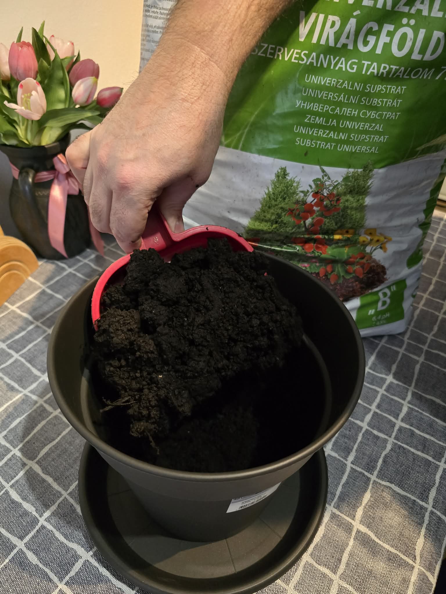 A virágcserepet félig töltsük meg egyszerű, általános virágfölddel.