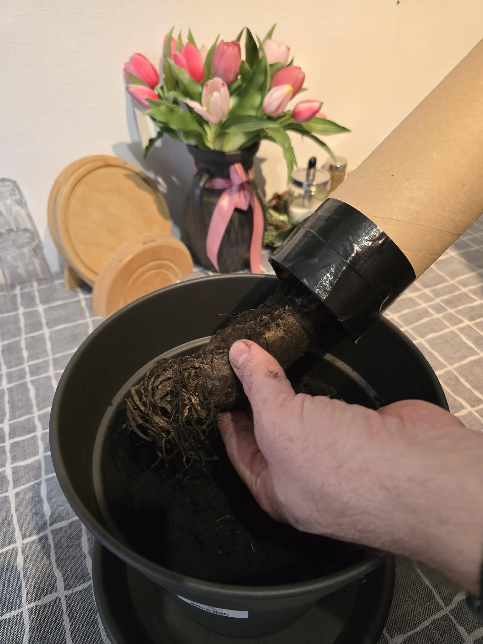 A növényt gyökerével lefelé belecsúsztatjuk a papír hengerbe.