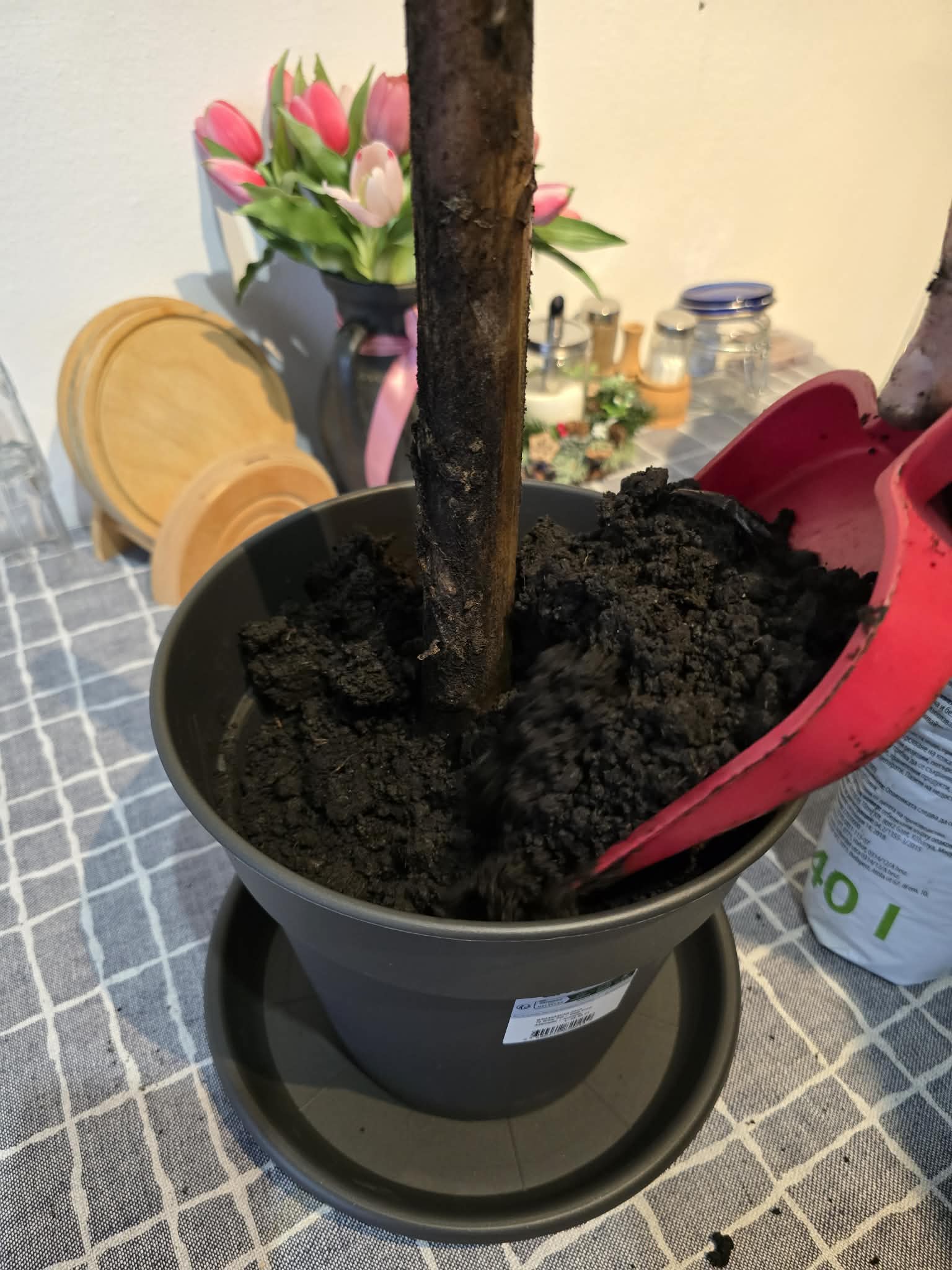 Ültessük a növényt el a cserépbe, s a cserepet töltsük fel virágfölddel a megfelelő szintig.
